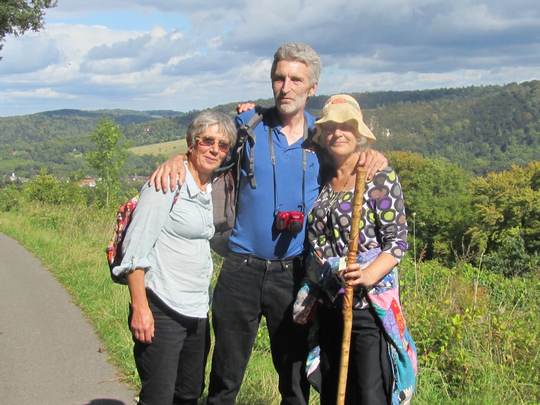 Left - Me, Celia, Man's Deke Leonard and Malcolm Morley - the inspiration for 'Rucksack In My Shot'; Right - With the two Celias